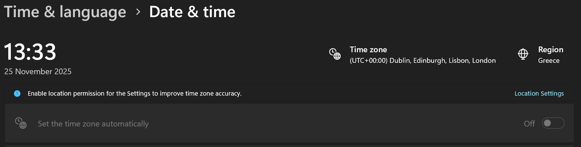 In my case, this was set to “GTB Standard Time”, which was wrong. Although I wanted to keep my region as “Greece”, I needed to change the timezeon to “GMT Standard Time”. If I did not know the exact name of the timezone I’d want to use, I could list all the available options like so: